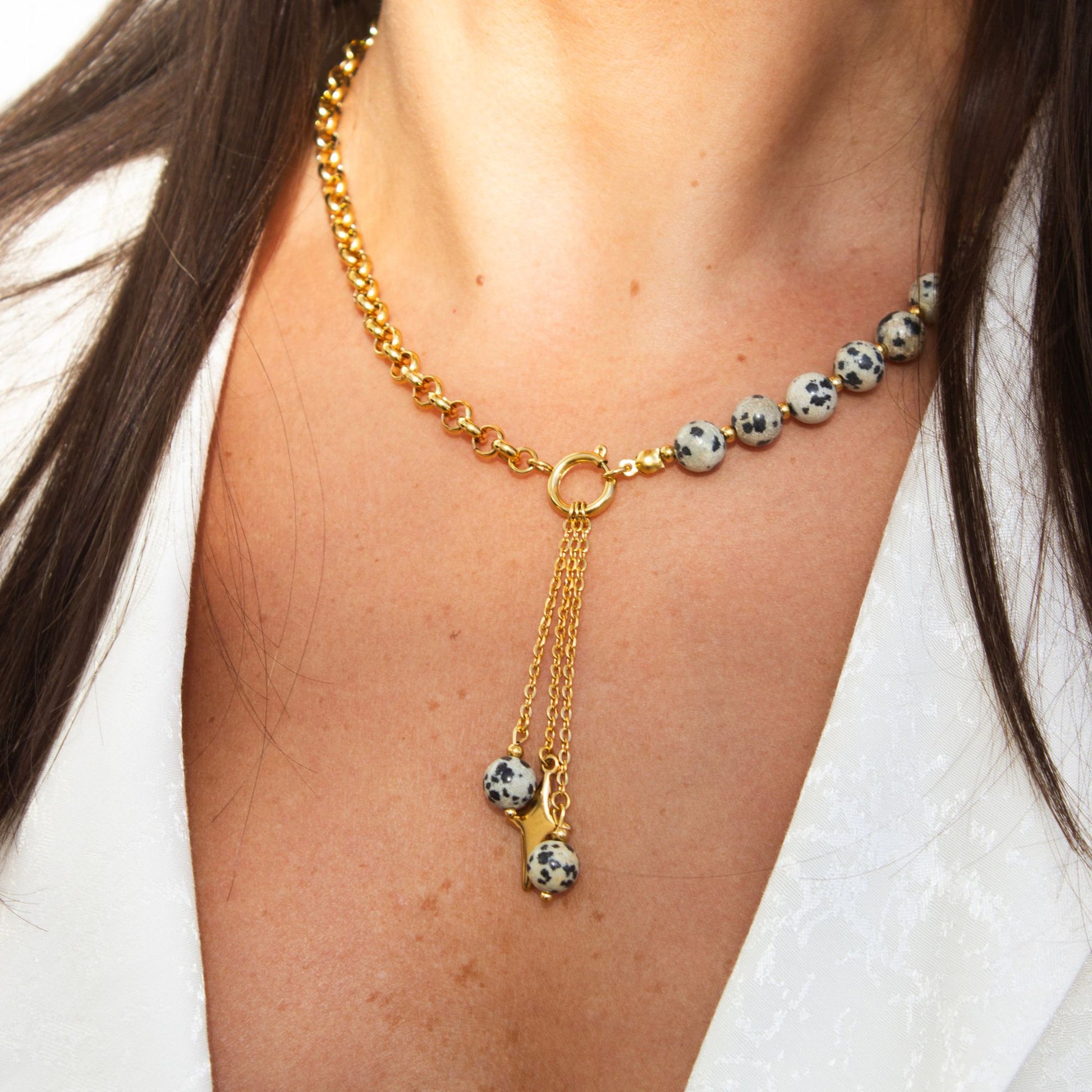 Colar dourado com pedras de jaspe dálmata em composição fluida e moderna. O detalhe central com correntes pendentes adiciona movimento e estilo.