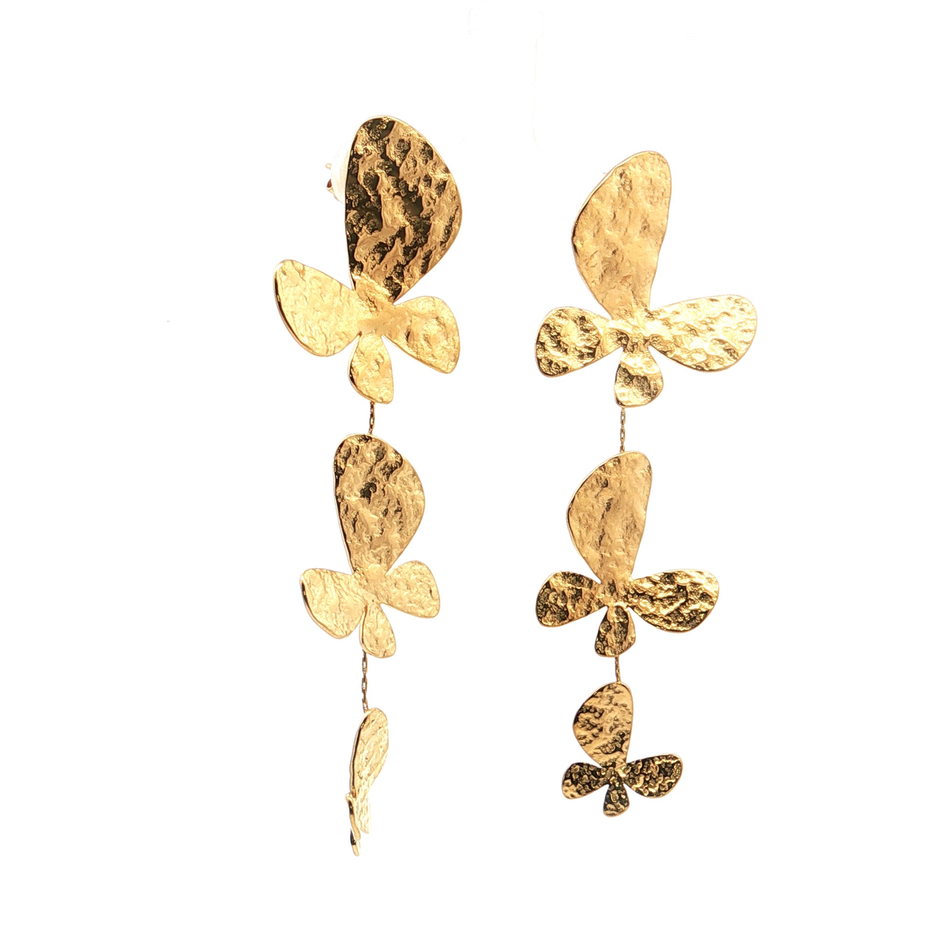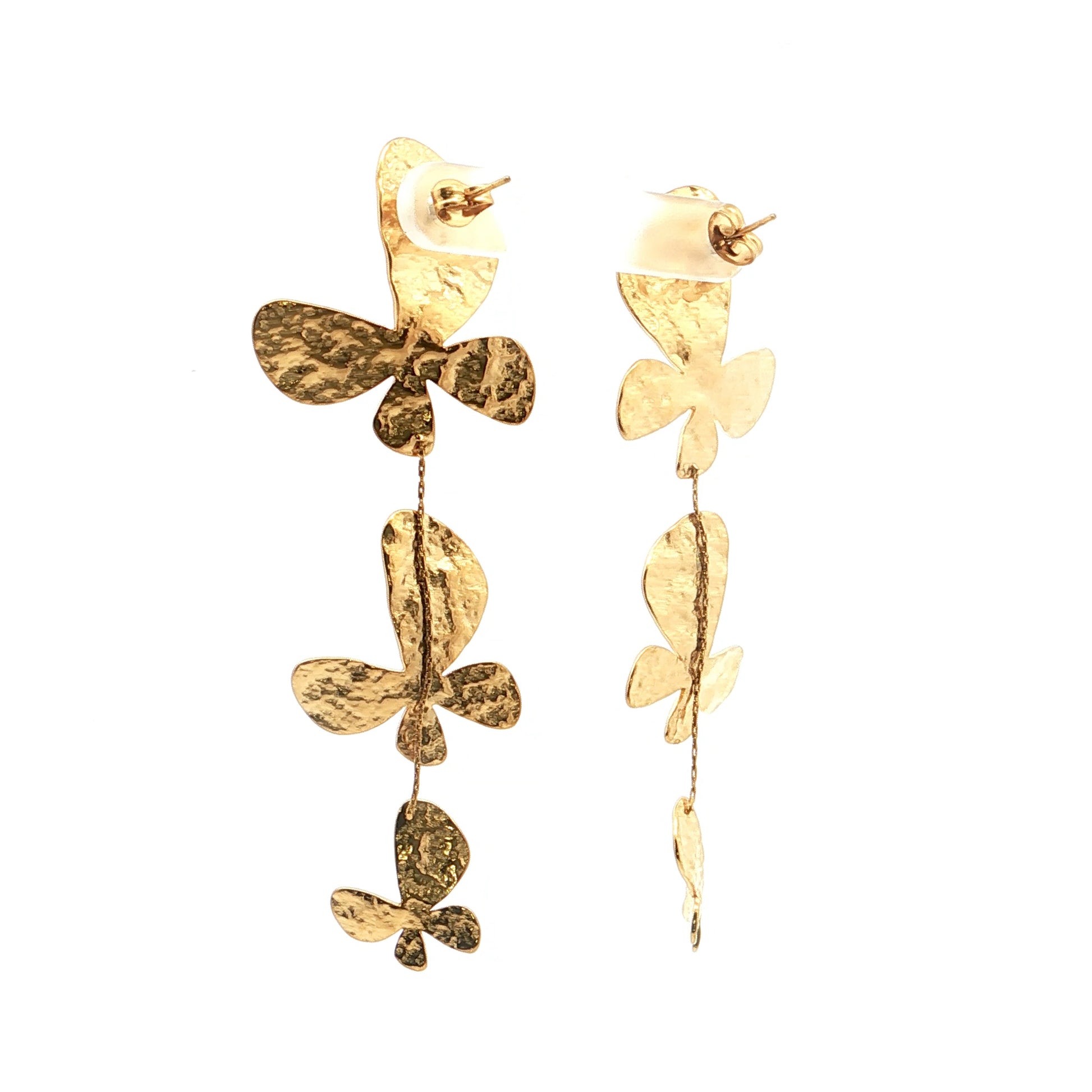 Brincos longos dourados com formas florais marteladas ligadas em sequência. Leves e fluidos, trazem movimento e um toque artístico inspirado na natureza.