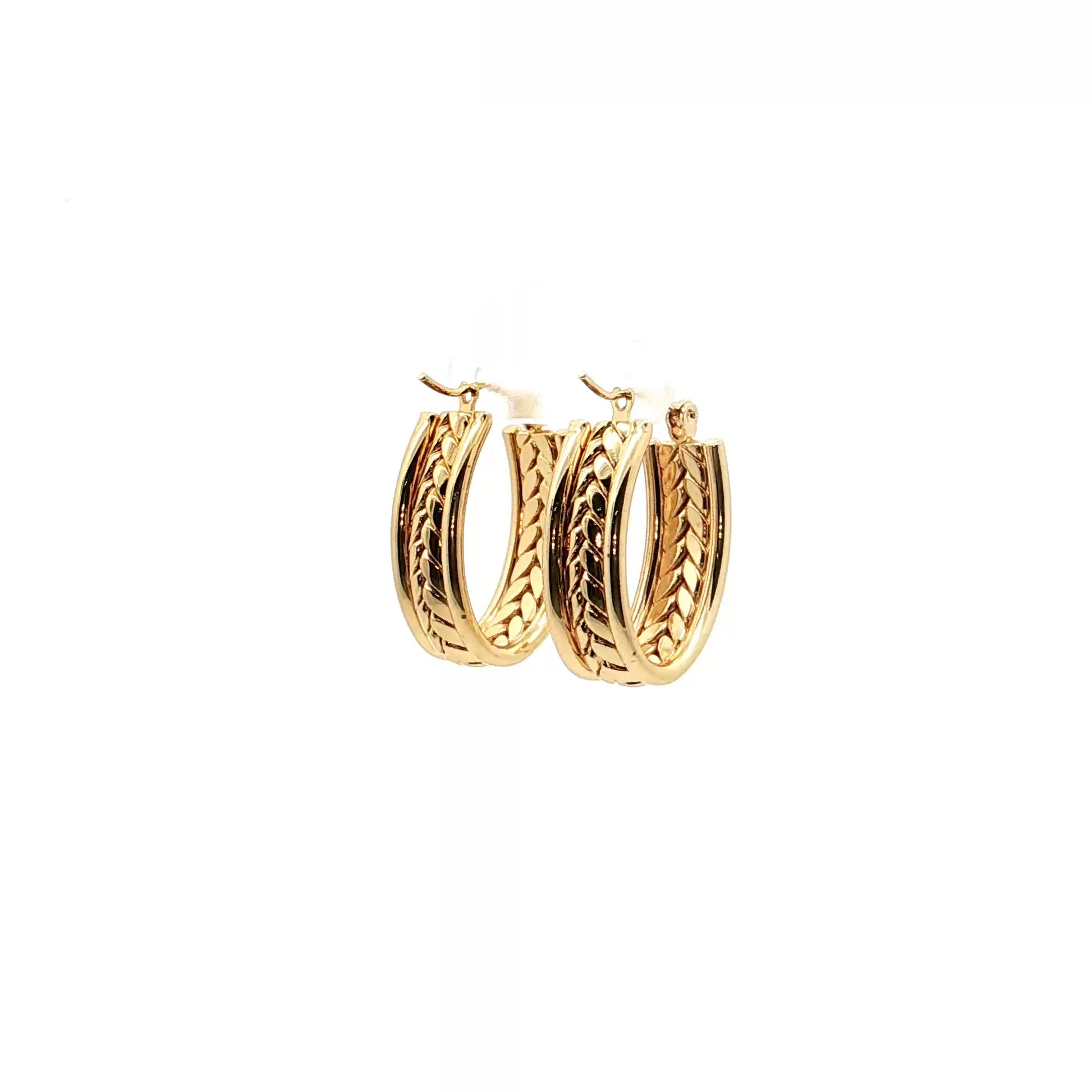 Design sofisticado que une textura e brilho numas argolas douradas com entalhe em padrão de folha.