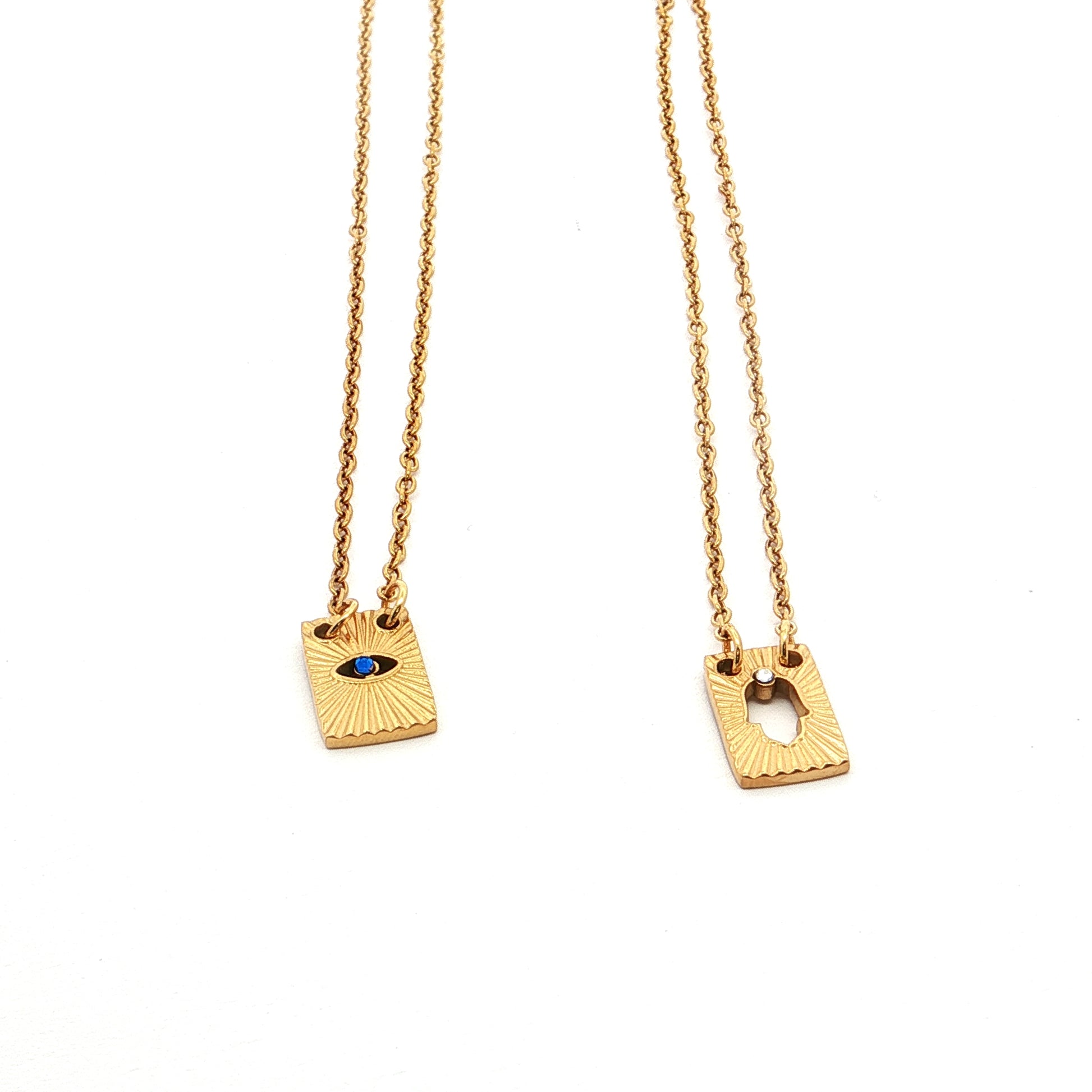 Escapulário com símbolos de proteção, o Olho Grego e a Mão de Fátima que representa energia positiva e afasta o mau-olhado.